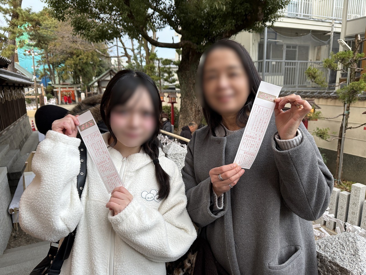 手を清めてお参りを済ませましたが、珍しく奥さんがおみくじを引くと言い出し、娘も付き合うことになりました。